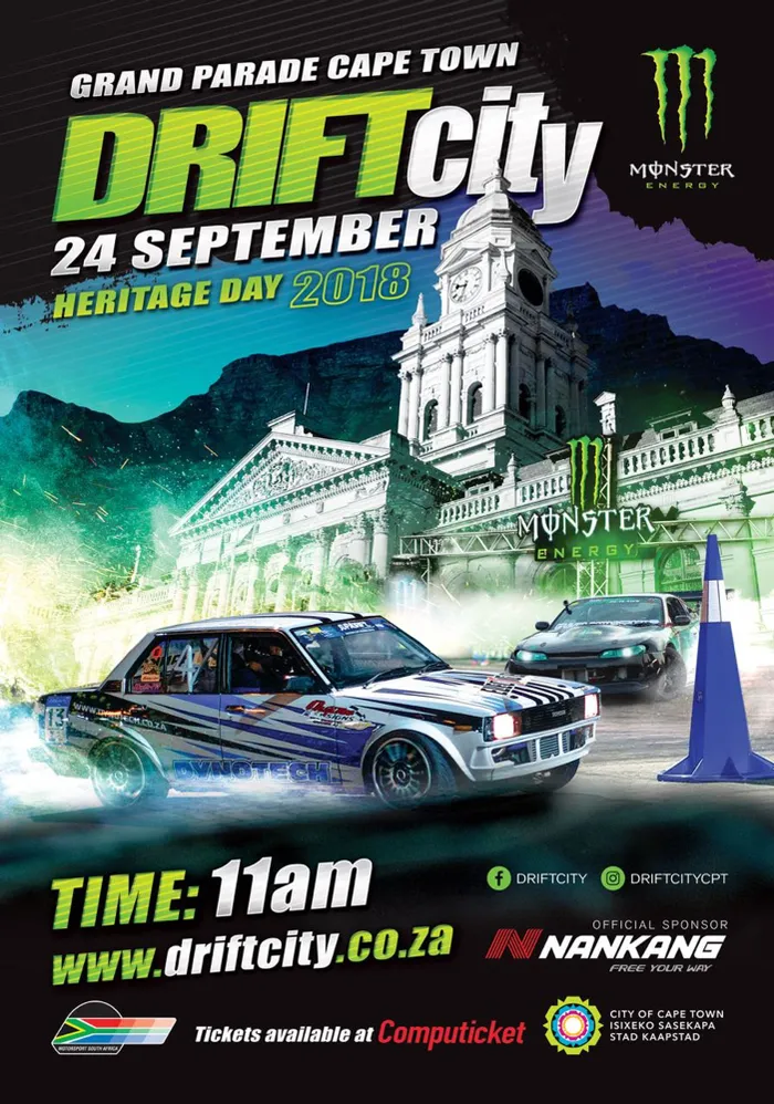 Drift City, a spectacular sideways spectacle, is slinging into the Grand Parade to bring us a day and night of tyre-munching mayhem.