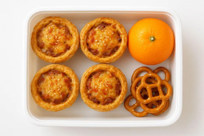 Preheat the oven to 180 °C. Cut the pastry into small squares or circles. Spoon a little chopped beef or lamb onto each piece. Add tomato paste and onion if using. Fold the pastry over and seal the edges. Sprinkle cheese and sesame seeds or paprika on top. Bake for 15-20 minutes or until golden and flaky. Pack the mini pies into the lunchbox. Include a drink (juice or water), a piece of fruit, and a small snack, like pretzels, mini crackers, or a few dried fruit pieces.