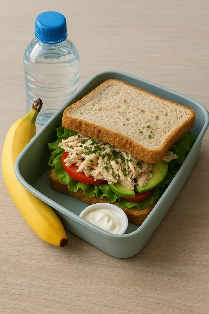 Shred the leftover chicken into small pieces. Mix with mayonnaise or chutney until well coated. Spread the mixture onto the bread or stuff into the roll. Add tomato, lettuce, avocado and herbs. Slice the sandwich in half and pack into a lunchbox Pack into a lunchbox with juice or water, a piece of fruit and a small snack, like a yoghurt.