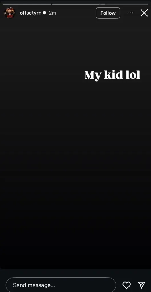 According to screenshots shared online, the Migos rapper - real name Kiari Cephus - took to his Instagram Stories, to write: “My kid lol”.