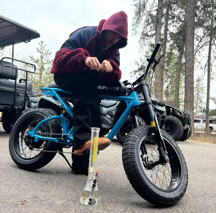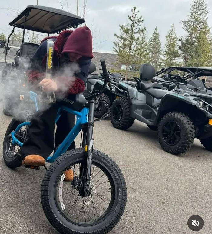 The latest episode involves Bieber sitting on an electric bicycle while smoking from a bong.