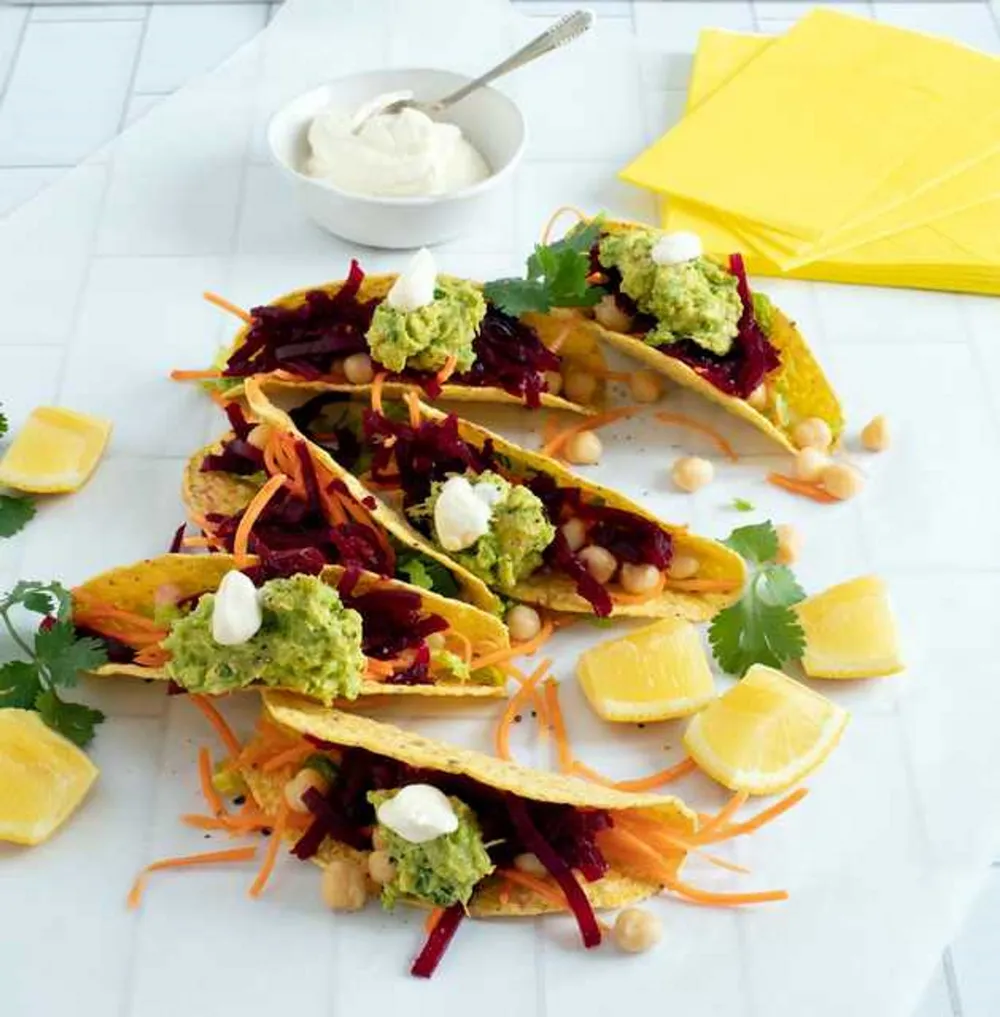 Fill the taco shells with layers of shredded lettuce, chickpeas, grated carrot, grated and spiced beetroot, avocado, and sour cream.