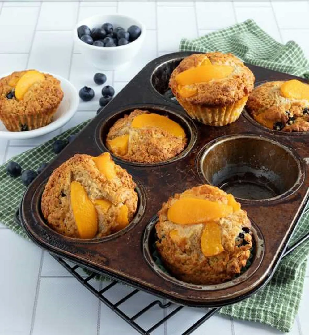 Decorate each muffin with a peach slice from the second can of peach slices.