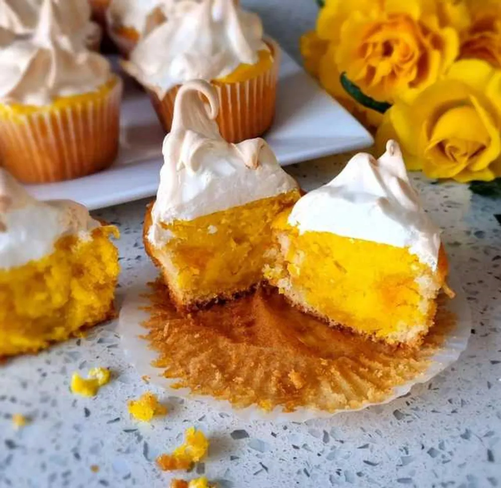 Remove from the oven and add a heaped teaspoon meringue on the cupcake. Smooth it out with the back of a spoon and fluff it up to peaks with a fork.
