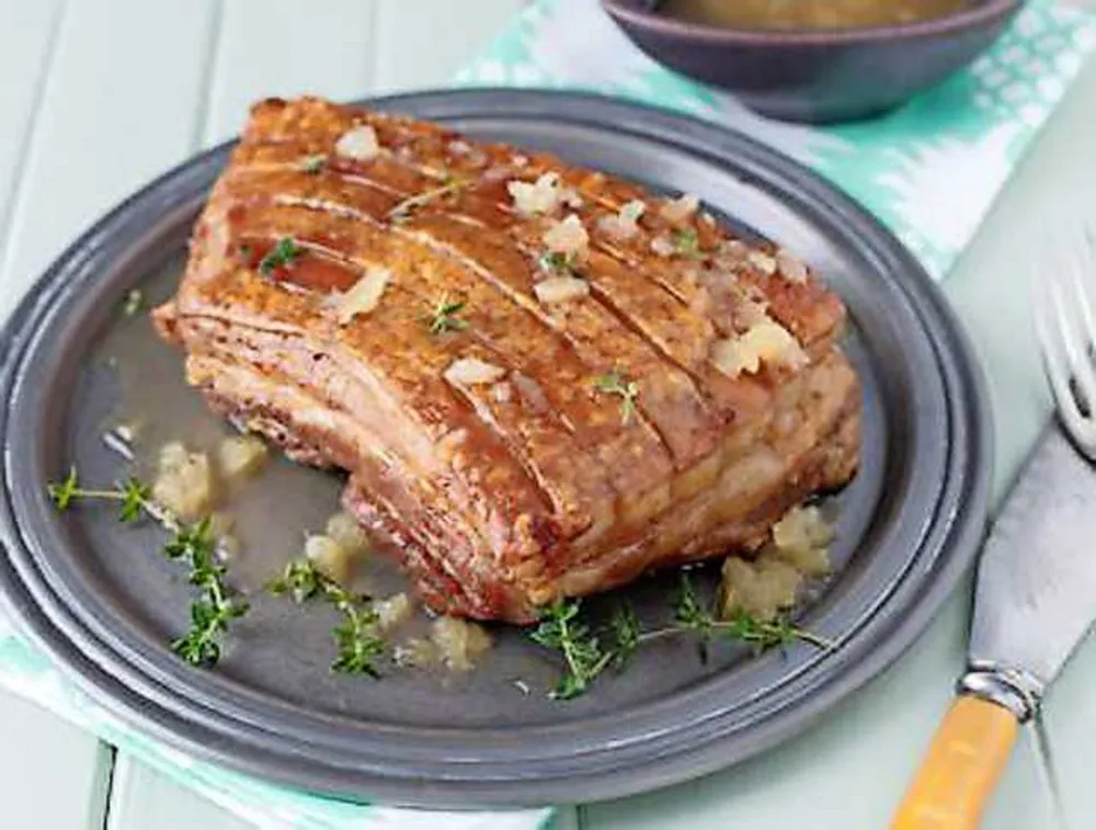 Turn the belly over, skin side up, and roast for a further 20 minutes or until the skin is crisp and golden. To make the glaze, bring the brown sugar and the vinegar to the boil and then reduce the heat and simmer until syrupy.