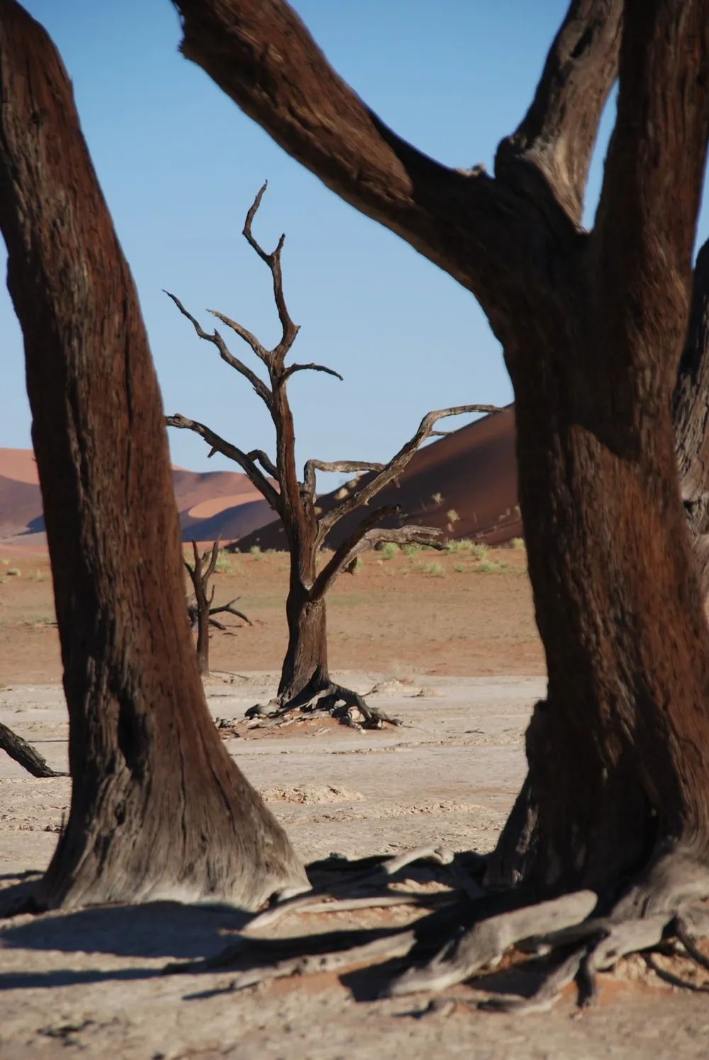 Sossusvlei means "the gathering place of water". Climbing the dunes yields breathtaking views, including the Deadvlei, a ghostly expanse of dried, white clay punctuated by skeletons of ancient camelthorn trees.