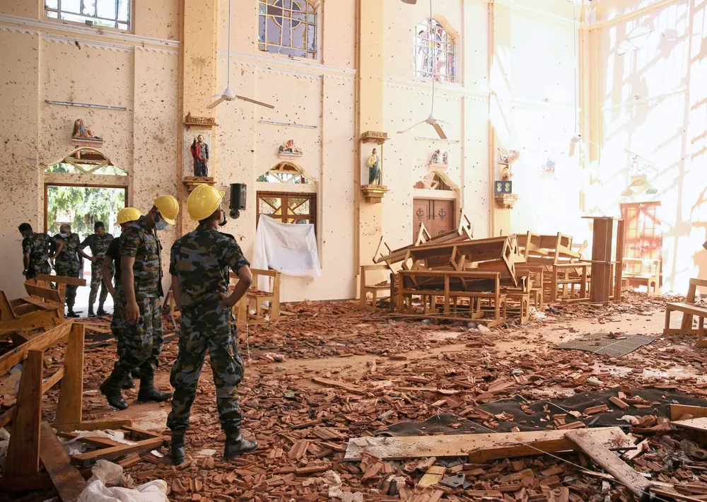 A view of the damage at St. Sebastian Catholic Church, after bomb blasts ripped through churches and luxury hotels on Easter. Photo: Athit Perawongmetha/Reuters