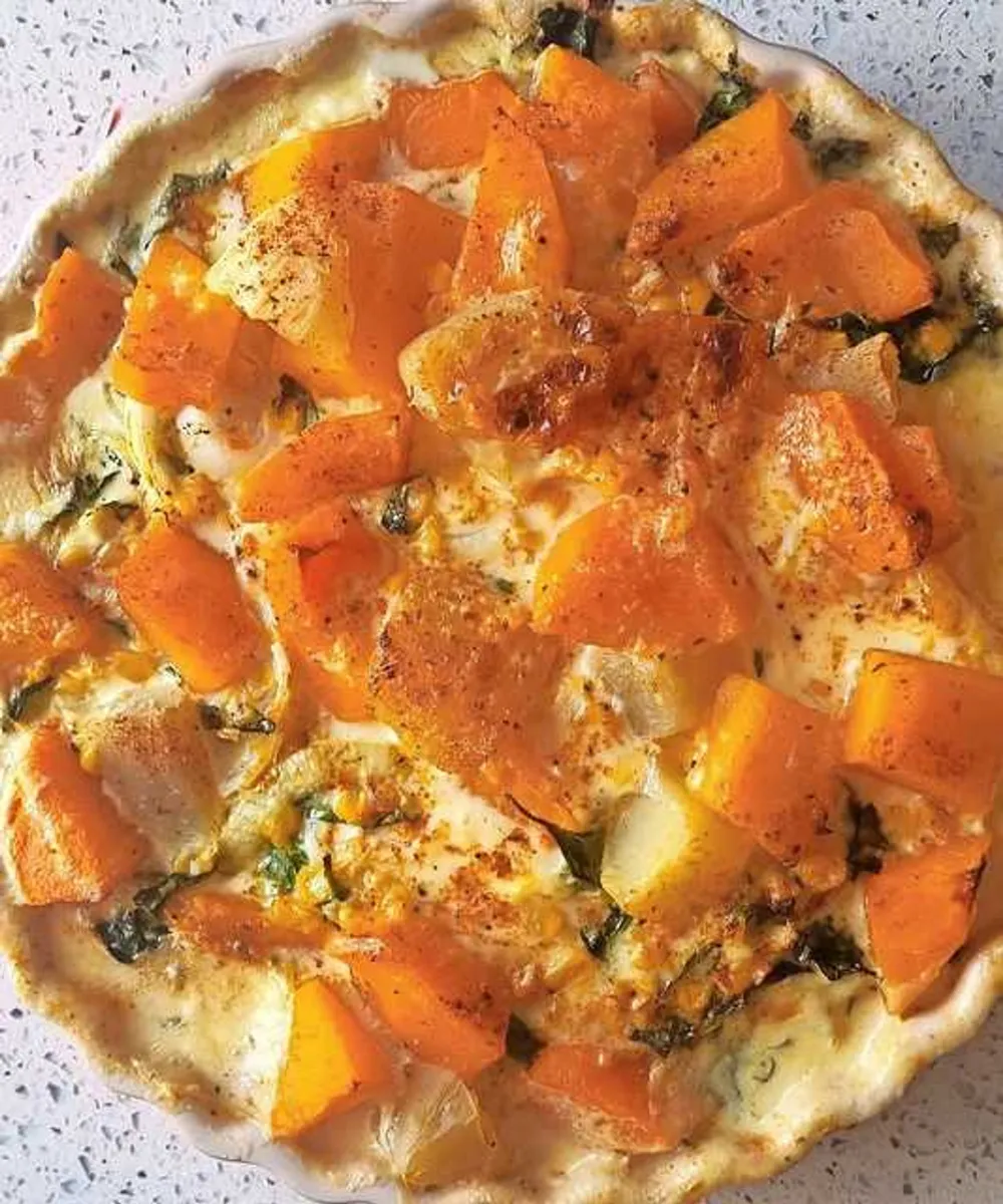 In an oven safe dish, add half of the steamed butternut and sweet potato.
