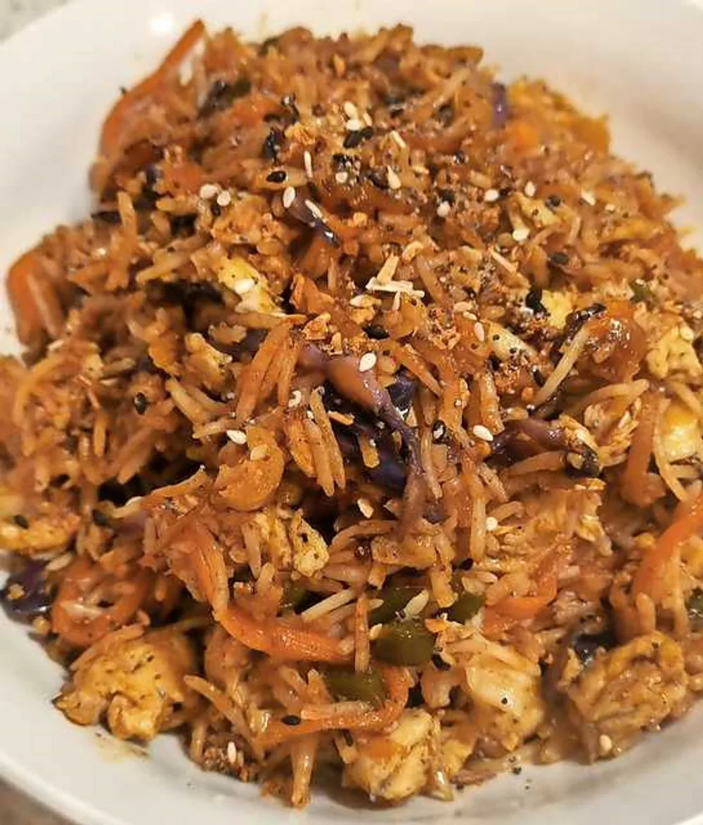 Add the cabbage and carrot and stir fry for two to three minutes. Add the rice and sauces and mix until well coated. Give it a quick stir fry.