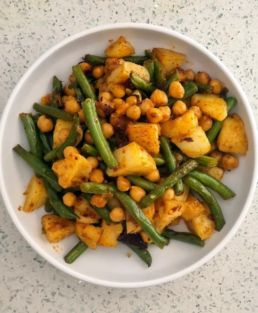 Once the onion and garlic turn golden brown, add in the green beans and stir fry until soft.