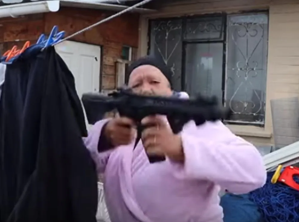 The video features his alter ego Felicia, as well as his mom Valda Saunders, 63, as an AK47-toting auntie who gets upset about dust getting on her wet laundry.