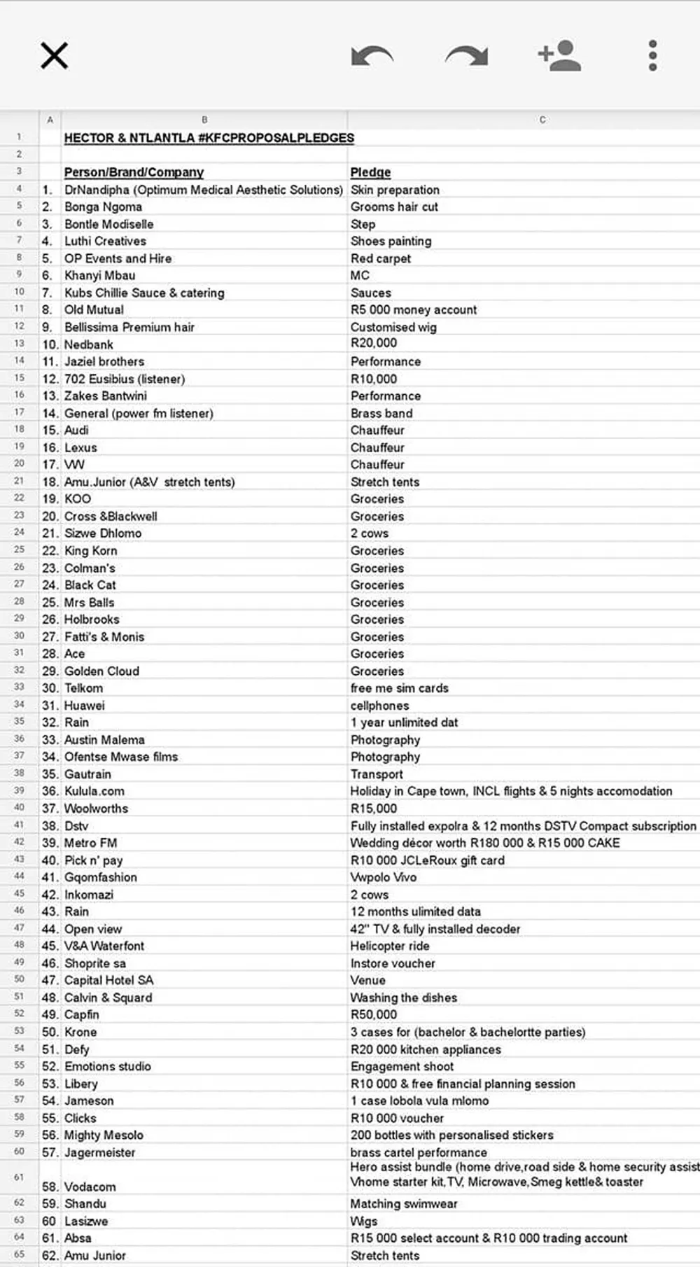 Also thrown in are a trip to Cape Town for the Toni Braxton concert sponsored by McDonald’s; debt clearance from Standard Bank; a honeymoon in Zanzibar from Mango Airlines; Khanyi Mbau offered to be the MC; while hundreds pledged groceries, haircuts, photography and chauffeur rides.