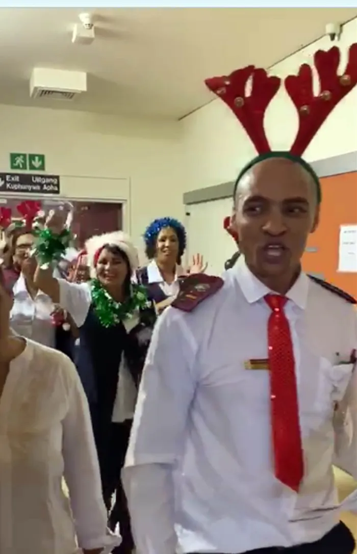 Armed with drums, a guitar, tambourines and Christmas keppies, the male and female nurses paraded with excitement.