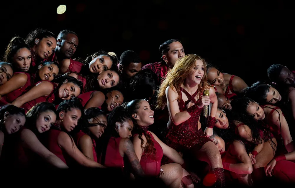 Dressed in a sequined, ruby-red outfit with matching boots, Shakira, 43, led her team of dancers through snippets of hits such as Whenever, Wherever and Hips Don’t Lie, before giving way to J-Lo.