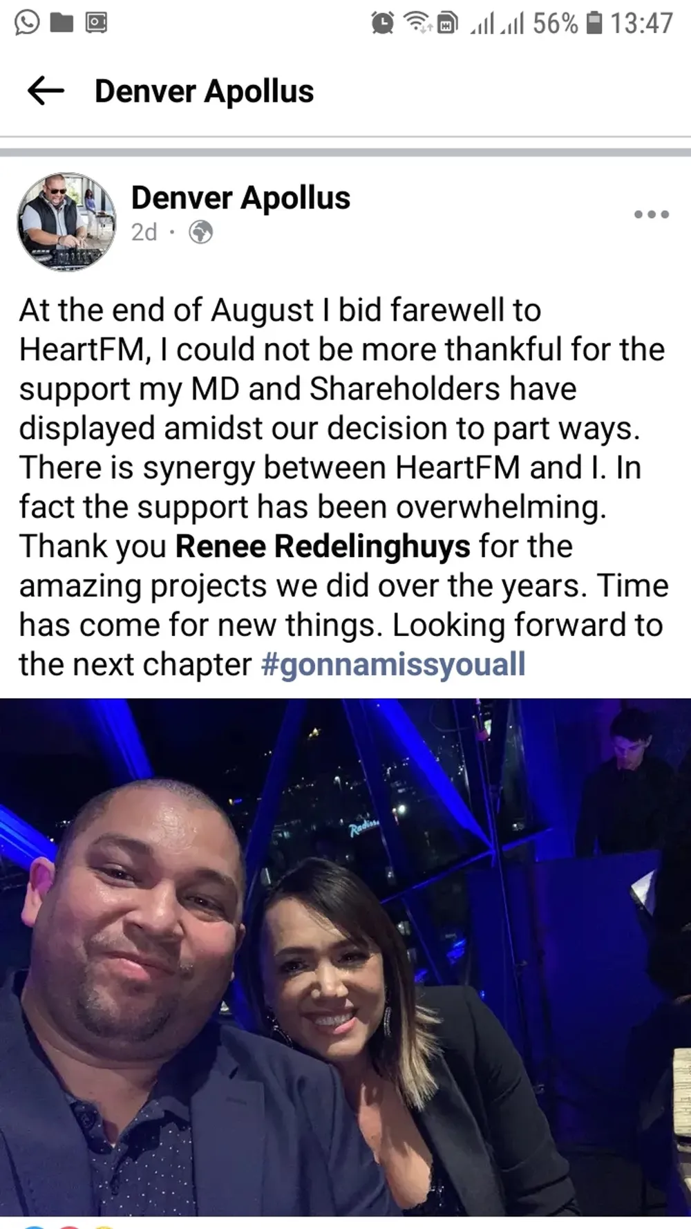 Heart FM’s former head of radio innovation, Denver Apollus, shared this week on social media that he would be leaving the station at the end of the month.