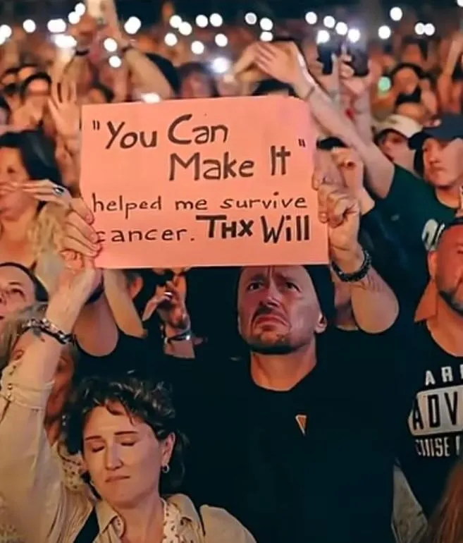 Footage on the video shows a clip shows a man's blurry hand holding a sign which reads: “You Can Make It" helped me survive cancer. THX Will.'