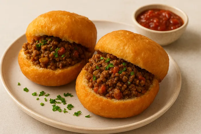Mpumalanga: Vetkoek with Mince - deep-fried dough pockets filled with savoury mince, a popular street food and family treat.
