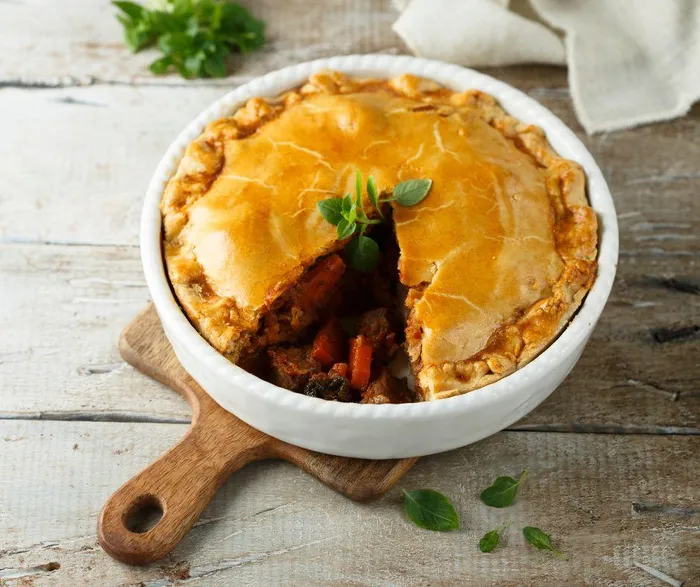Transfer the mixture to a large baking dish and cover with the pastry, sealing the edges and cutting small slits on top to release steam.