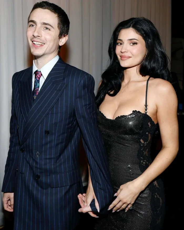 The cosmetics queen accompanied Chalamet to the awards show, wearing a slinky black gown with lace insets on the side. Chalamet was equally stylish in a pinstripe suit and a colorful tie.