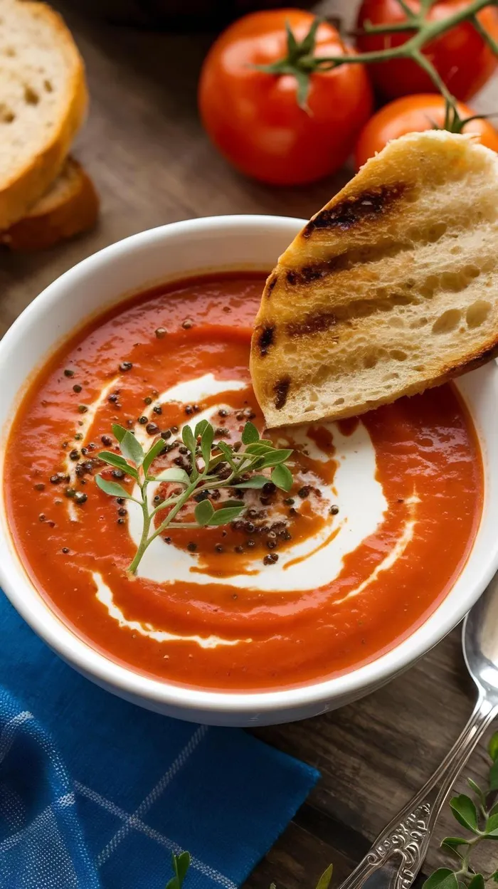 Serve hot, garnished with basil leaves and a swirl of cream if desired.