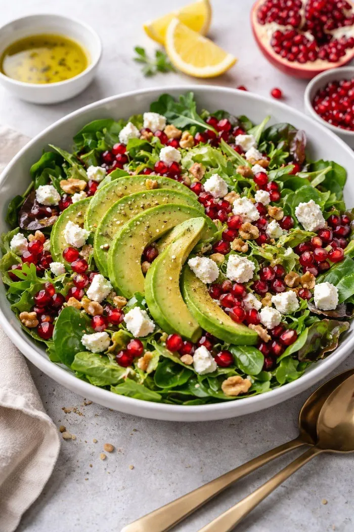 In a large bowl, combine salad leaves, diced avocado, feta, and pomegranate seeds.