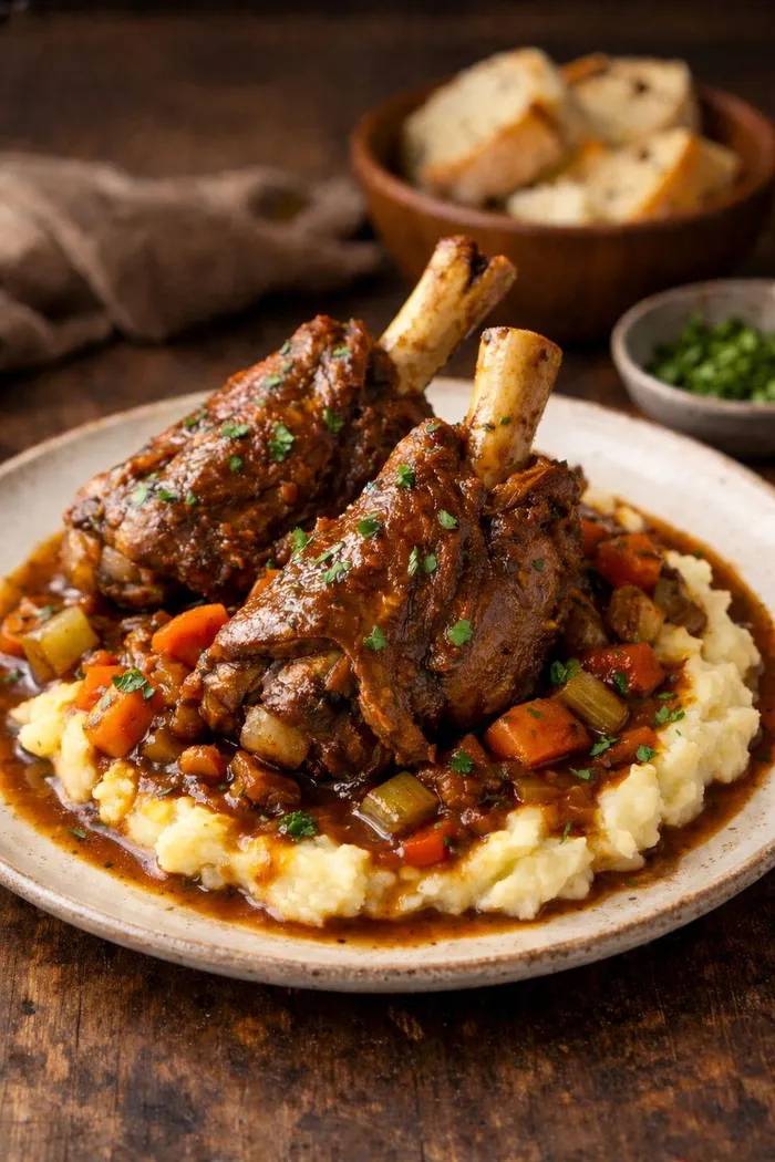 Serve the lamb shanks over creamy mashed potatoes or polenta. Spoon the sauce and vegetables over the top and garnish with parsley.