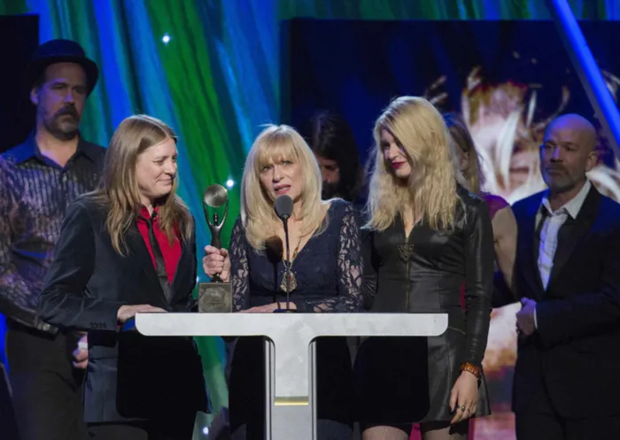 LEGACY: Wendy O'Connor (C), sister of former Nirvana singer Kurt Cobain, speaks at Nirvana's was inducted to the Rock and Roll Hall of Fame
