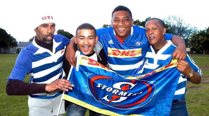 MET YS, JA: Jacques Ryk and Ben-Anthony Fransman of Citrusdal stieked uit for match. FUN: Jocem Basson posing with John Fransman from Citrusdal. SUPER FANS: Michelle Pedro, Edwin Claasen, Eldrey Davids and Godwin Fortuin of Grabouw at Newlands.