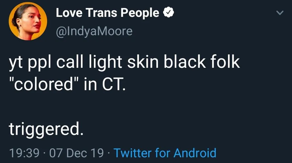 Moore, who happened to be visiting Cape Town, took their Twitter page saying, "yt(white) people call light skin black people colored in CT. triggered".