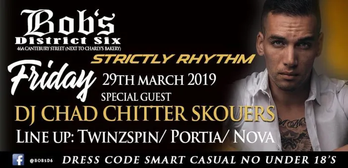 - Friday, at Bob’s District 6 it’s Strictly Rhythm with DJ Skouers featuring Twinzspin, DJ Portia and Nova. Entry is R50.