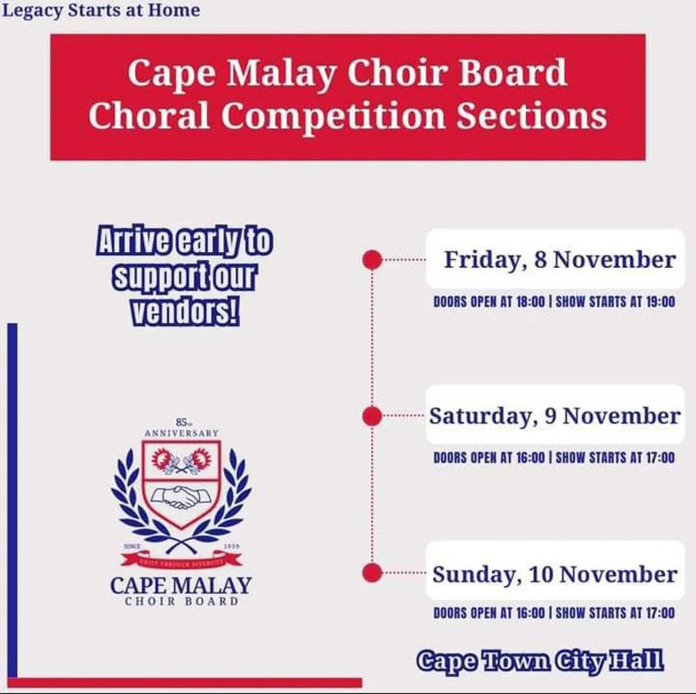 From 8 to 30 November, the Cape Malay Choir Board will host its annual choral competitions, which also forms part of the organisation’s 85th anniversary at the City Hall, which will host the sections stage from Friday, 8 November to Sunday, 10 November 2024.