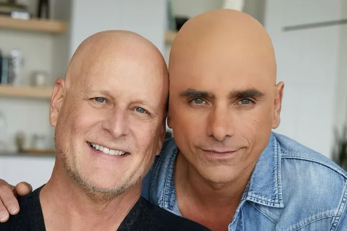 Coullier is seen smiling with his freshly-shaven head, while Stamos covered up his trademark hair with a bald cap.