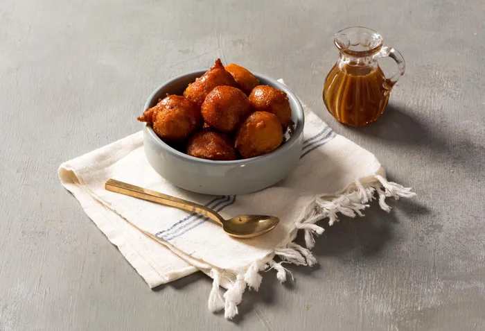 Arrange the fritters in a serving dish and pour the caramel sauce over them before serving.