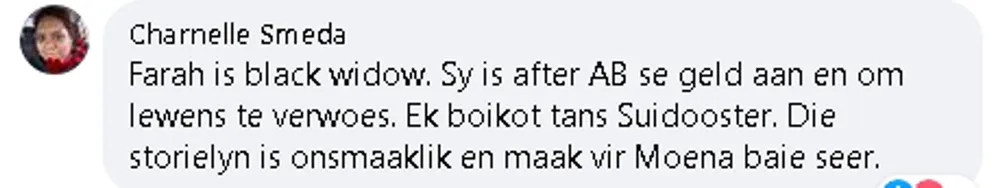 undefinedCharnelle Smeda wrote: “Farah is black widow. Sy is agter AB se geld aan en om lewens te verwoes. Ek boikot tans Suidooster. Die storielyn is onsmaaklik en maak vir Moena baie seer.”