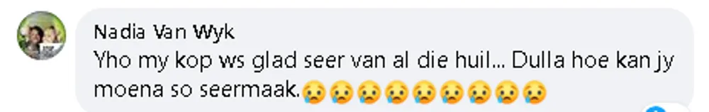 Nadia Van Wyk said: “Yho my kop was glad seer van al die huil...(sic)” while Lameez Moses posted: “Farah must fall”.