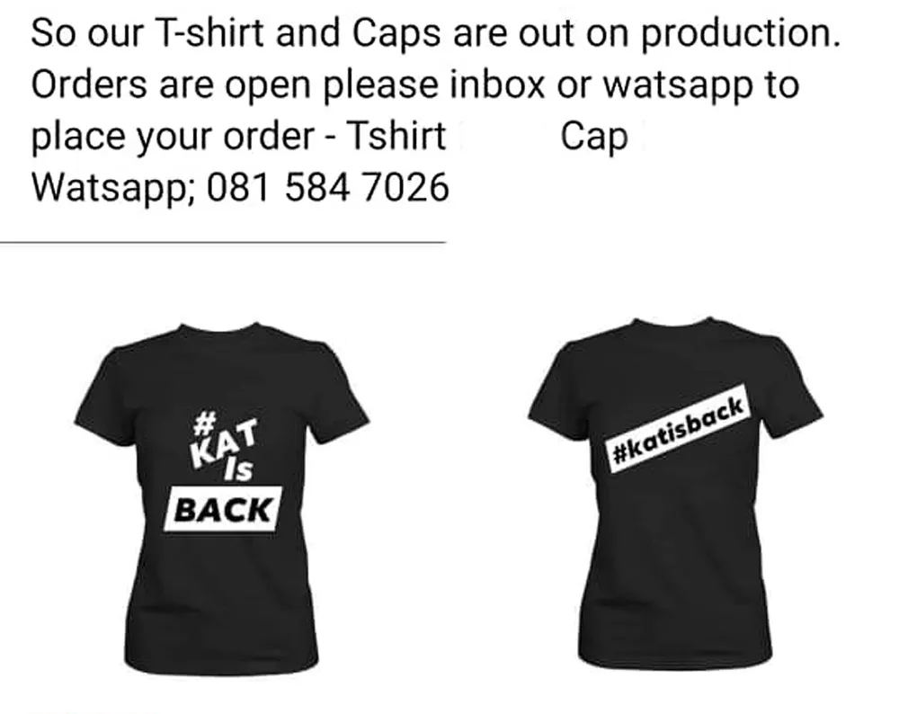Facebook fans have even designed black #Katisback T-shirts and caps, which are for sale for R100 and R70 respectively.