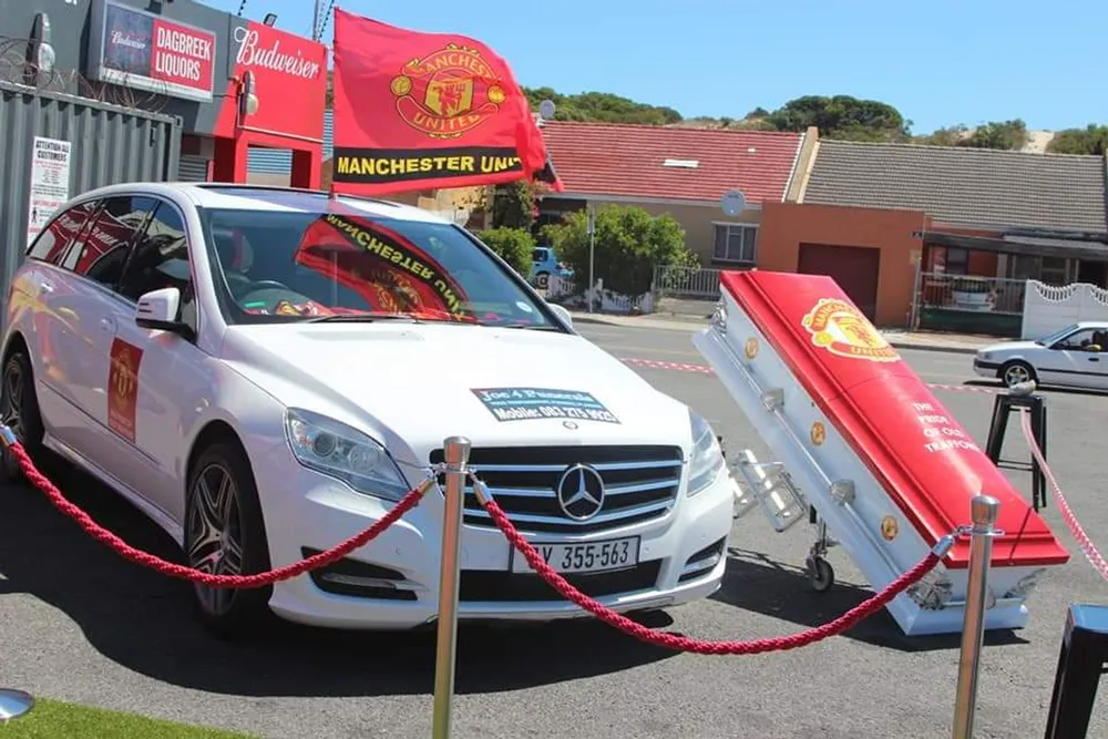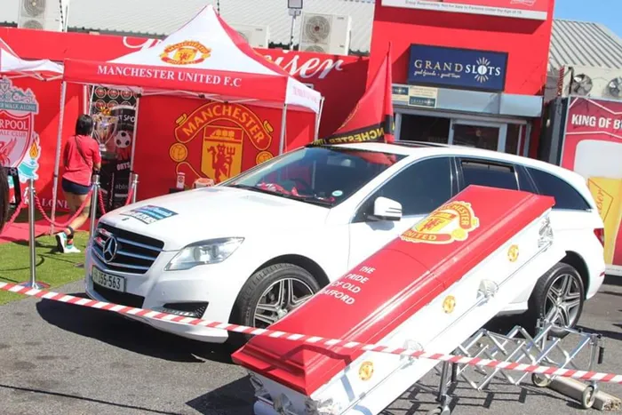 Premium Sports Bar is home to the Official Liverpool Supporters Club in Cape Town, and this was brought home by having a white coffin and hearse draped in Man United vlaggies.