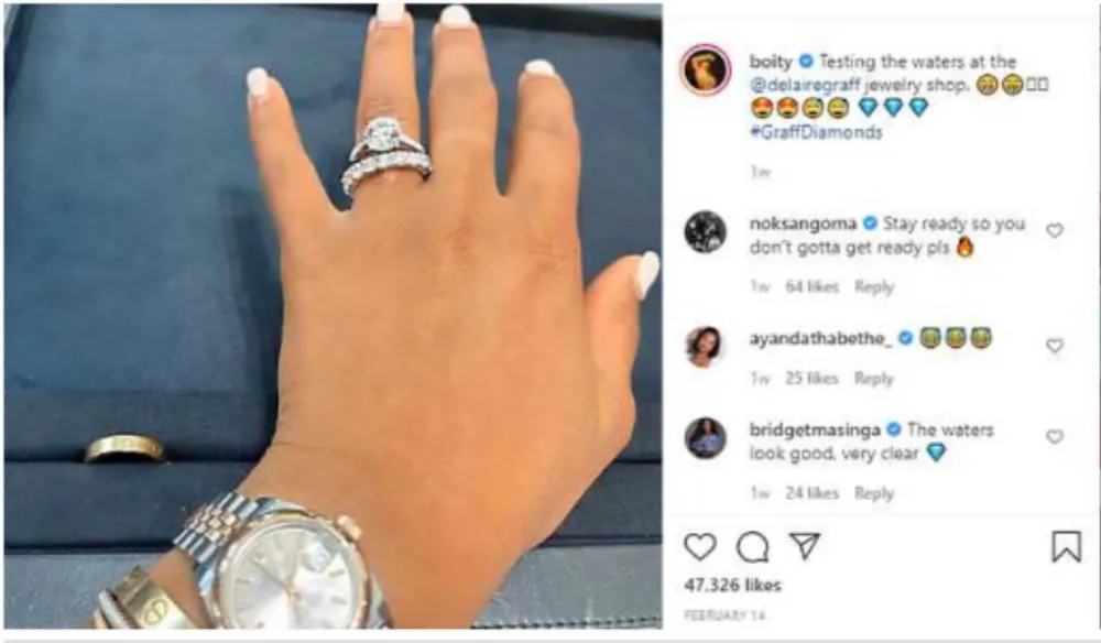undefinedWhile the reality star bought the ring for herself, Boity and Maps Maponyane are long believed to be an item, attending each others' birthdays and exchanging expensive gifts, writes ZAlebs.