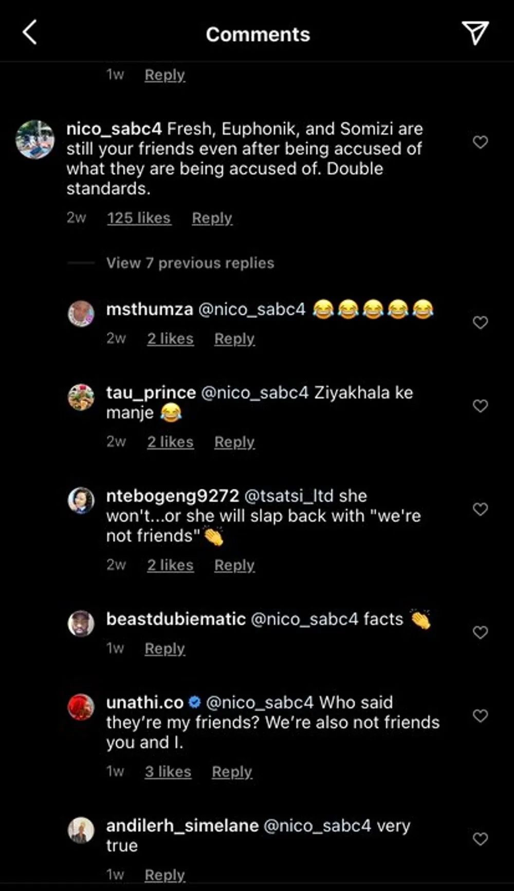 Media personality Unathi Nkayi has unfollowed Somizi Mhlongo on Instagram and has stated they are not friends.