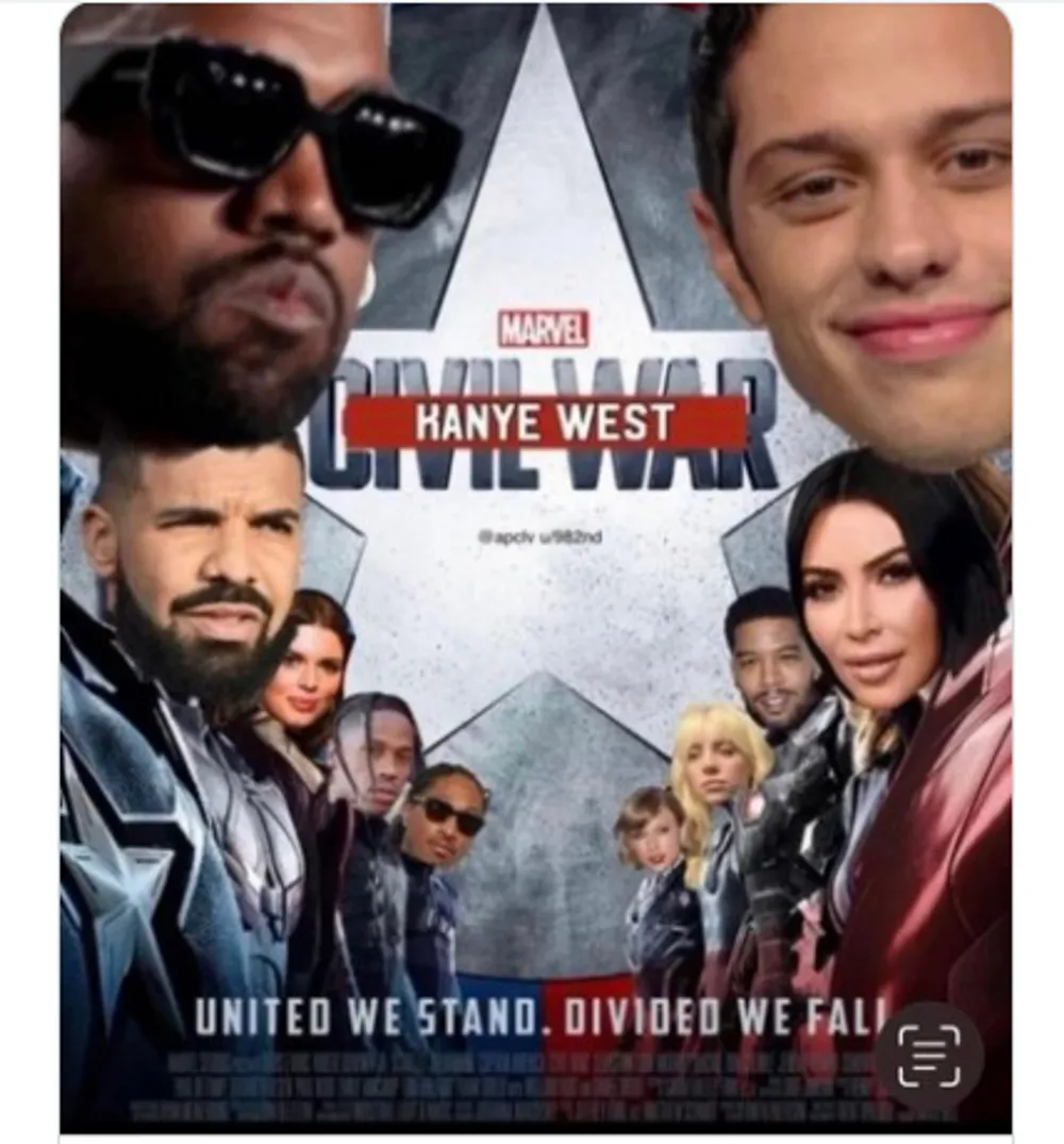 The 44-year-old rapper has dissed the 28-year-old comedian and shared a bizarre photoshopped Captain America Civil War film poster featuring Drake, Travis Scott and his girlfriend Julia Fox on his side of the battle line-up – against Pete, Kim, Taylor Swift, Billie Eilish and Kid Cudi.