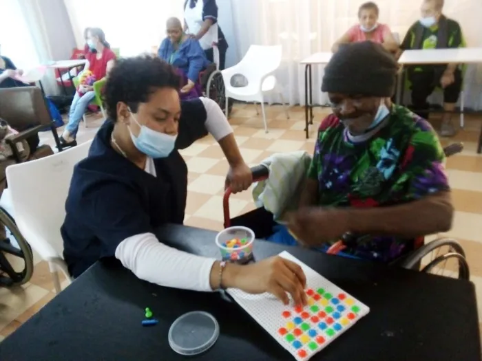 “Our programme consists of knitting, crochet, tapestry, pin board, beading, sewing, dominoes, cards, rummikub, ball games, gym, morning walks, singing and dancing.