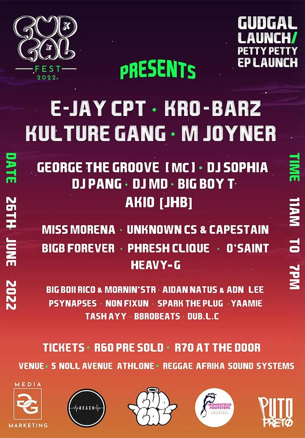 Artists on the line-up include Kro Barz, Kulture Gang, M Joyner, Miss Morena and Heavy G. DJs on the line up include MD, Akio and Sophia.