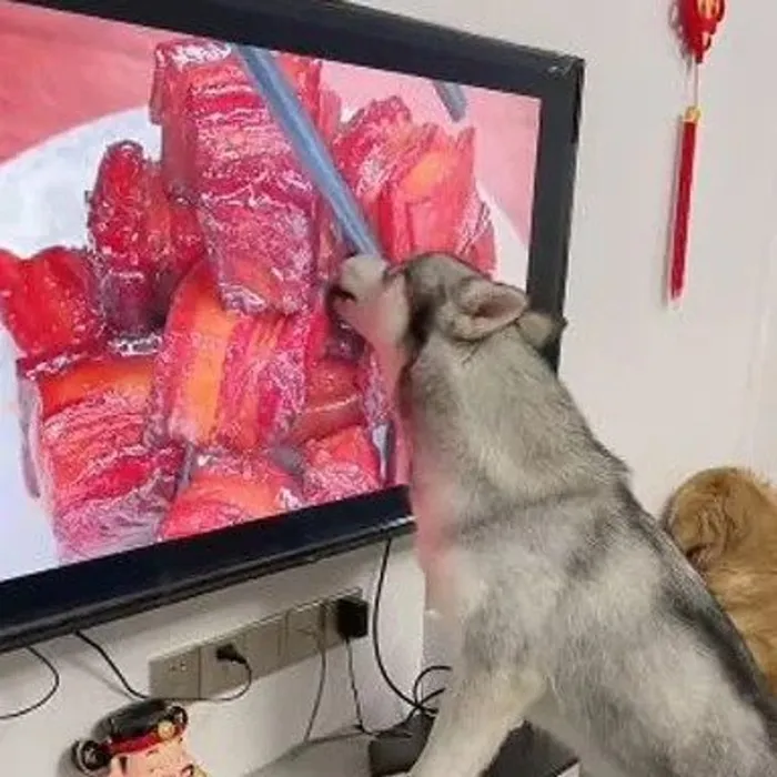 Adorable dog licking meat displayed on TV screen is the funniest thing you’ll see today. Picture: Sharing travel