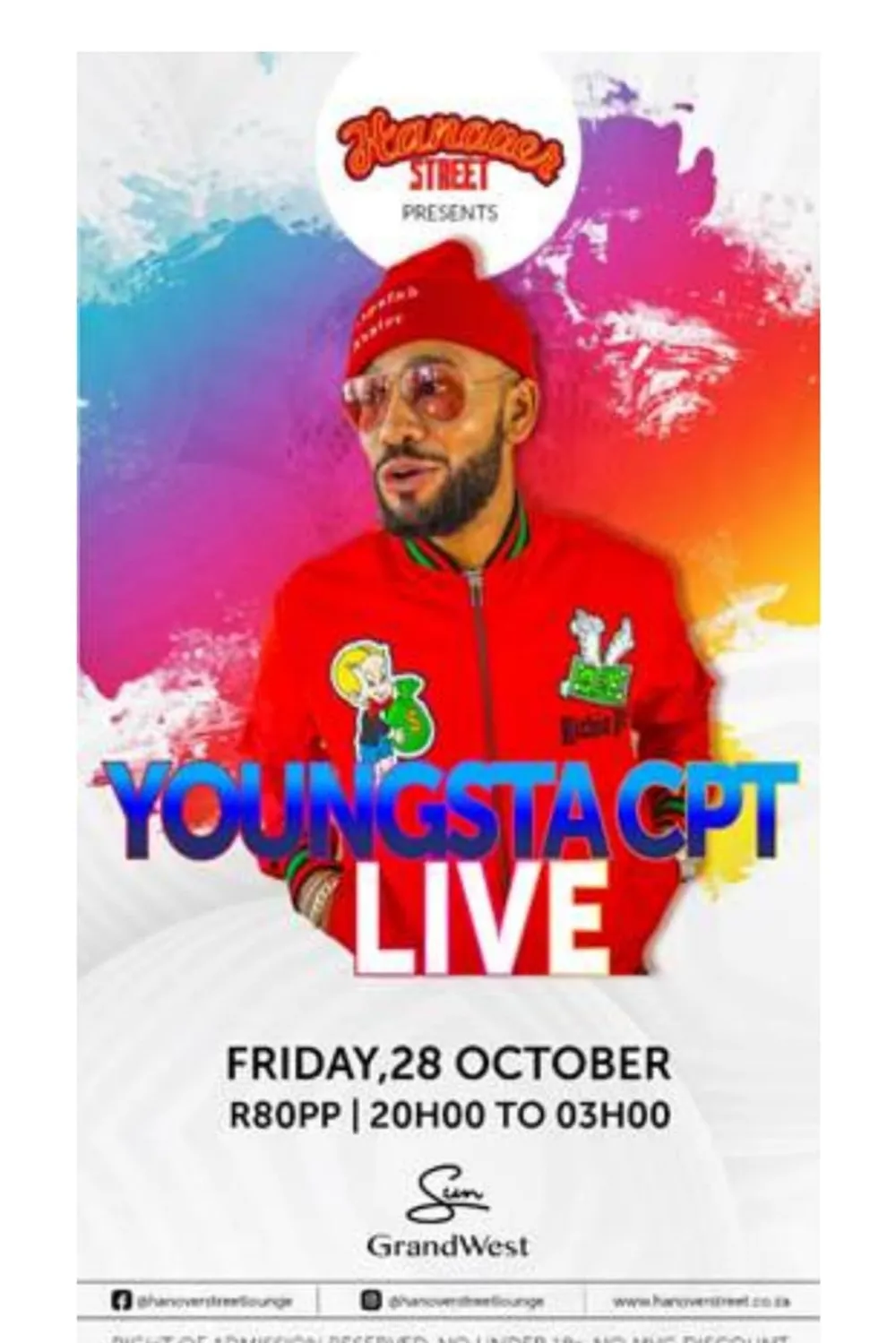 Kick off the last weekend of the month with YoungstaCPT live at Hanover Street from 8pm until 3am at R80p/p.