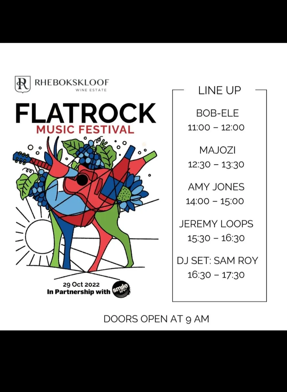 Flatrock Musical Festival presents Amy Jones, Majozi, Jeremy Loops, Bob-Ele and Sam Roy. Doors open at 9am to 6pm at Rhebokskloof Wine Estate.