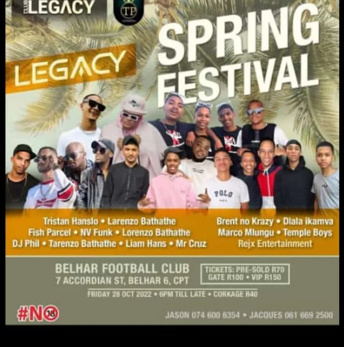 Club Legacy presents the Spring Festival at Belhar FC on Friday night from 6pm. Tickets are R70 pre-sold, R100 at the gate and R150 VIP, with performances from Tristan Harslo, Liam Hanz, NV Funk, Temple Boys and more. Corkage charge is R40.