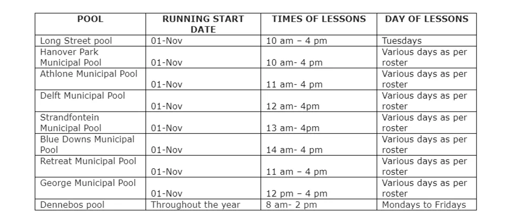 The lessons will commence from Saturdays from October 29 to December 3, and again from January 21 until March 4, 2023, at the Sea Point Pavilion and from November 12 until December 15, and again from January 15 until March 4, 2023, in Muizenberg.
