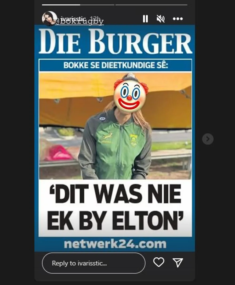 In the meantime, Springbok director of rugby Rassie Erasmus is yet to decide on the dietician’s fate after Ristic reportedly sent him proof, including screen shots of text messages, of the affair.