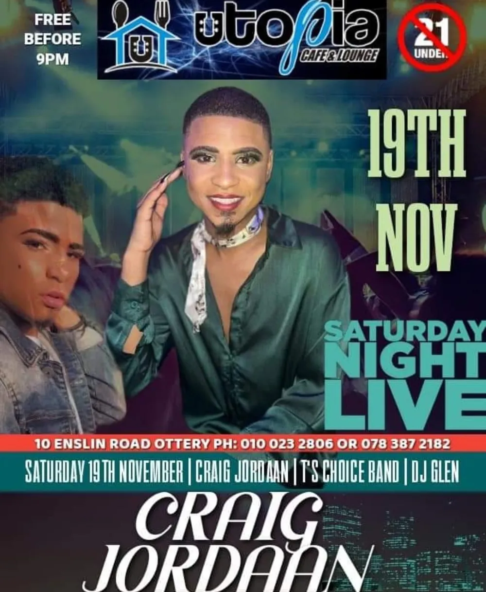 Idols SA’s Craig Jordaan will be at Utopia Cafe and Lounge on Saturday night for a live performance, joining him are TS Choice Band and DJ Glen.