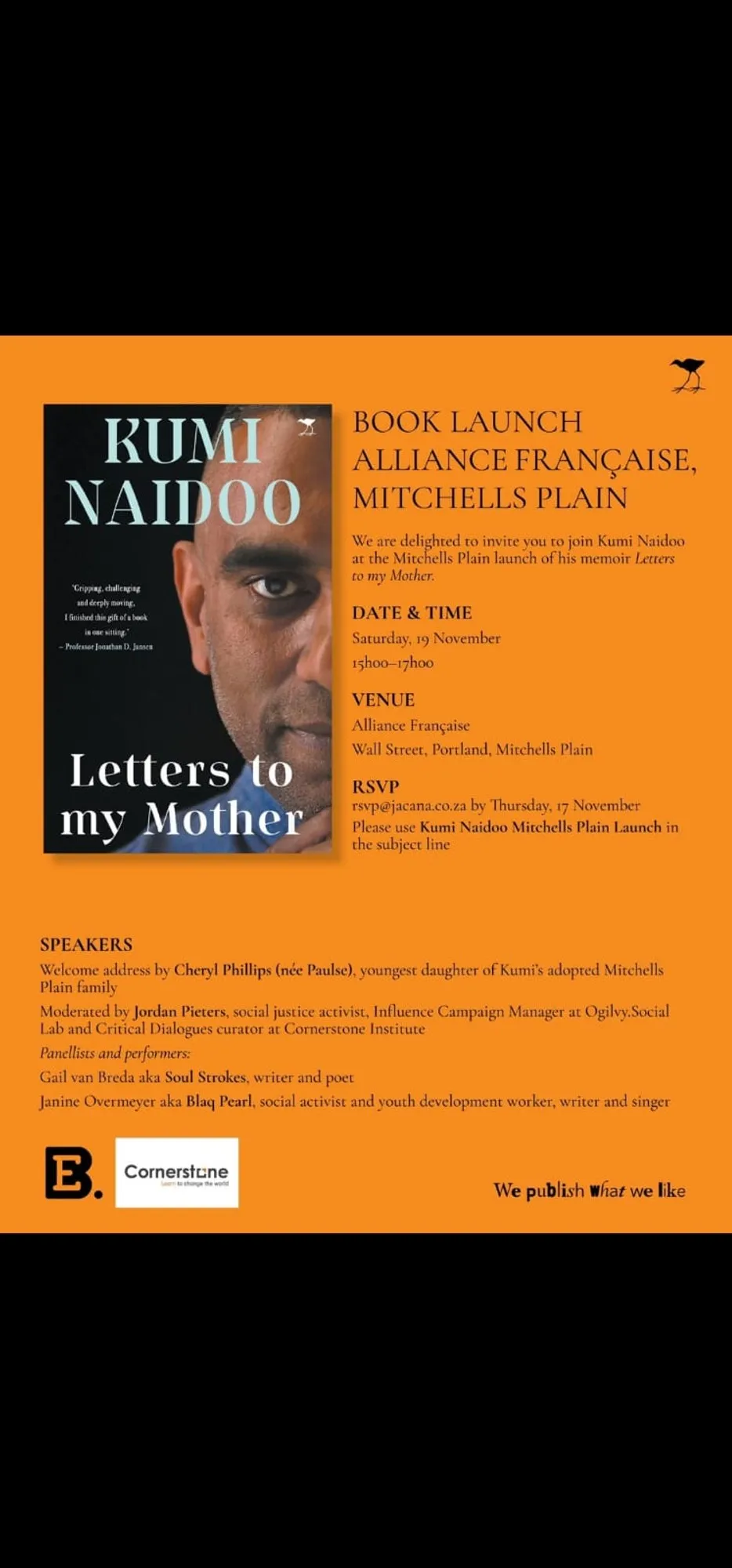 Join author Kumi Naidoo at the launch of his memoir titled ‘Letters to my mother’ on Saturday in Mitchells Plain in Wall Street, Portland from 3pm to 5pm.